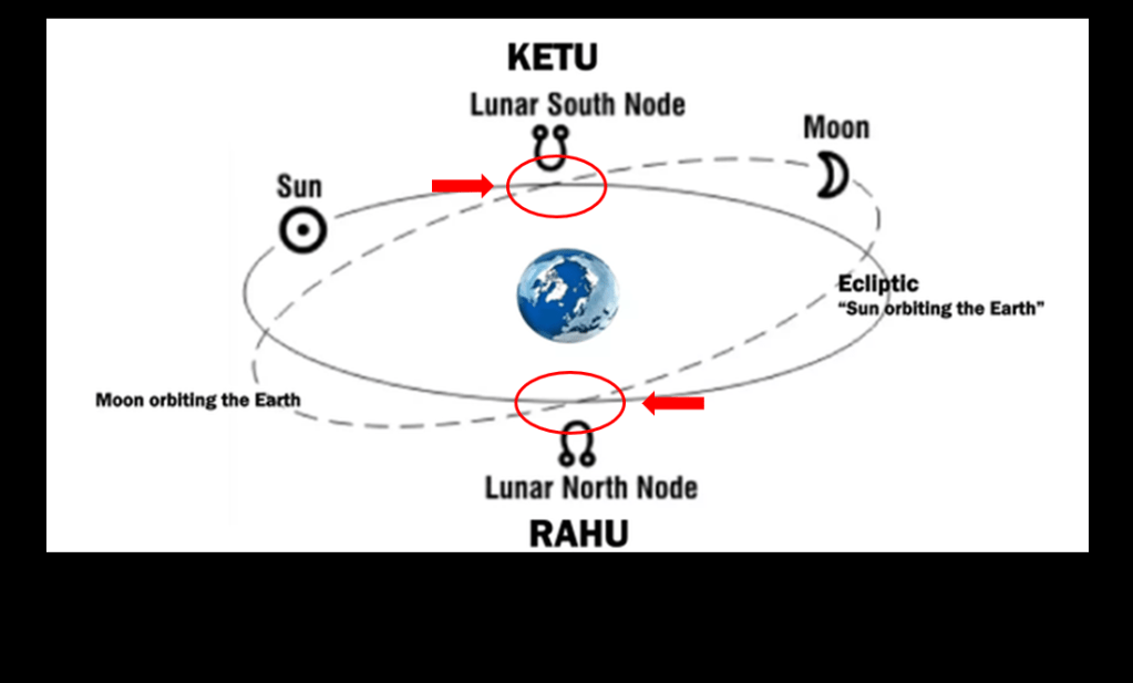 Now for Rahu and Ketu, who are merely shadow planets. As we already know (What does our Horoscope tell us?), Rahu and Ketu are not really planets, but merely represent the nodal points where the orbits of the Sun and the moon intersect. These are the points at which eclipses form.